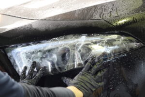 ヘッドライトにプロテクションフィルム施工。