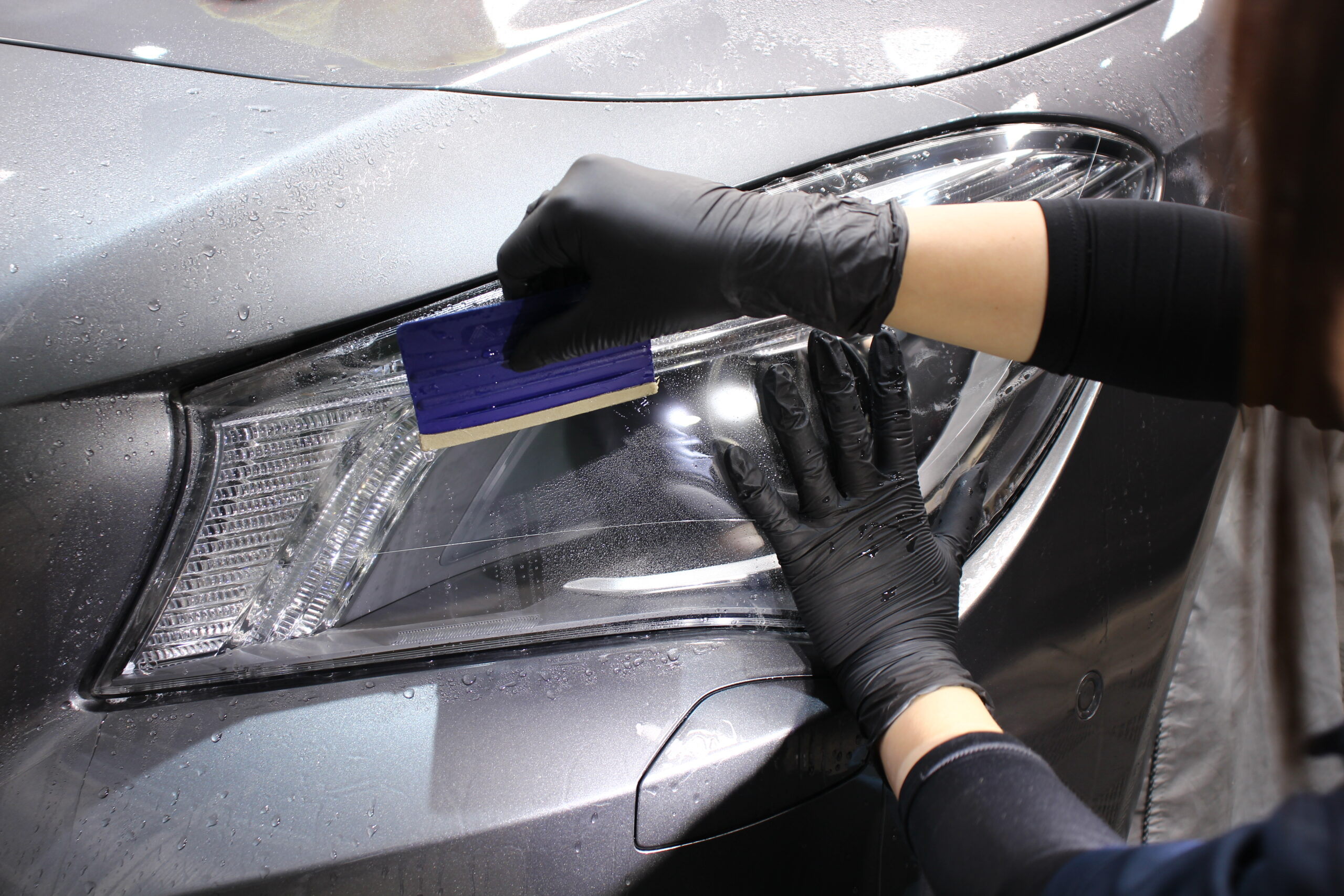 車が綺麗に見えるポイントは様々な部分に存在しますが、欧州車に多い窓枠のメッキモールやヘッドライトなど劣化すると古く見えてしまう部分を中心にプロテクションフィルムでガードします。