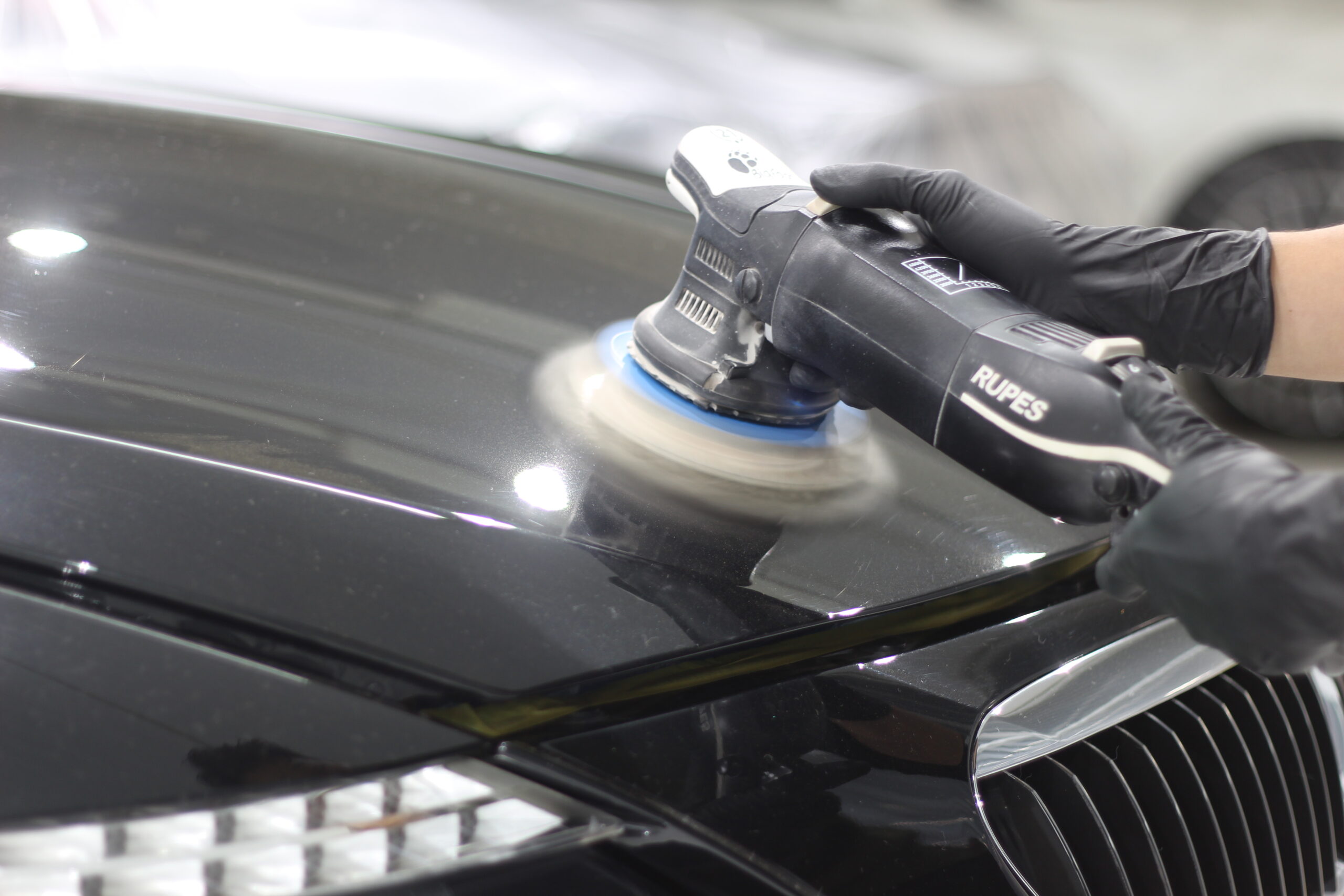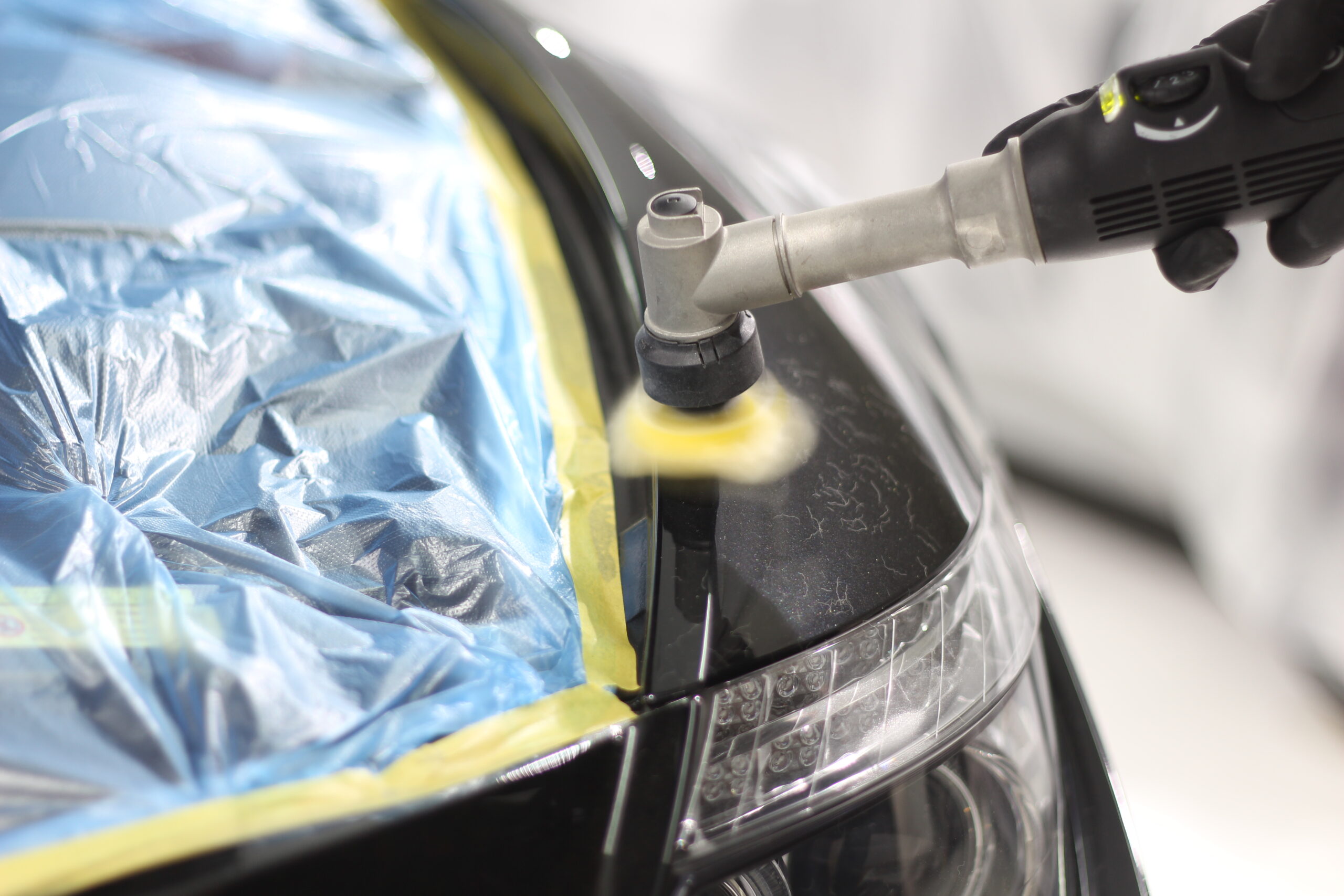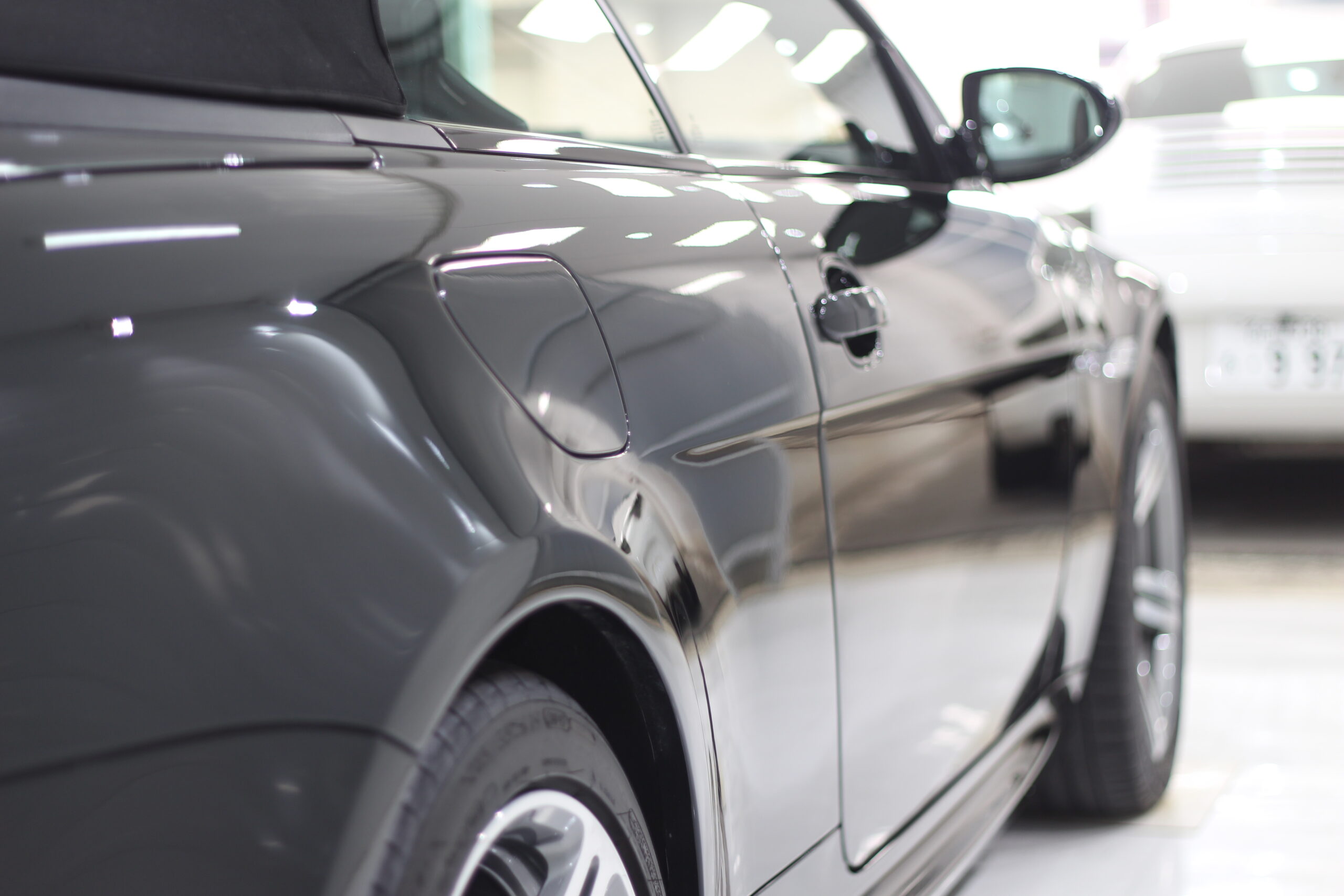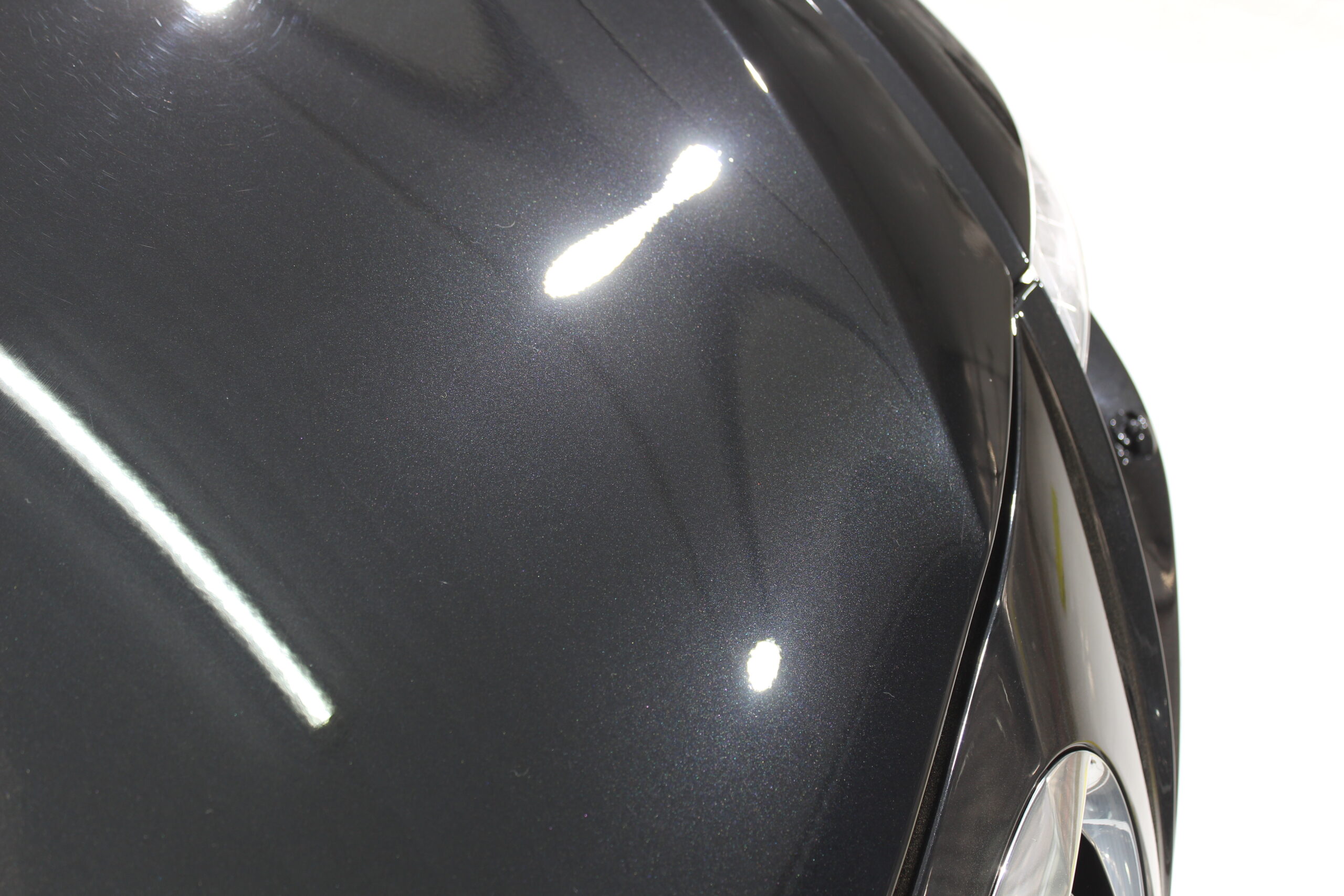 欧州車特有の非常に高硬度な塗装に長年のスクラッチ傷などが刻まれてしまい、通常の研磨ではなかなか除去して美しい状態に戻すことが難しいですが、ここは職人の腕と長年のノウハウで抜群の美しい塗装面に変化させる研磨術で下地処理をおこないます。