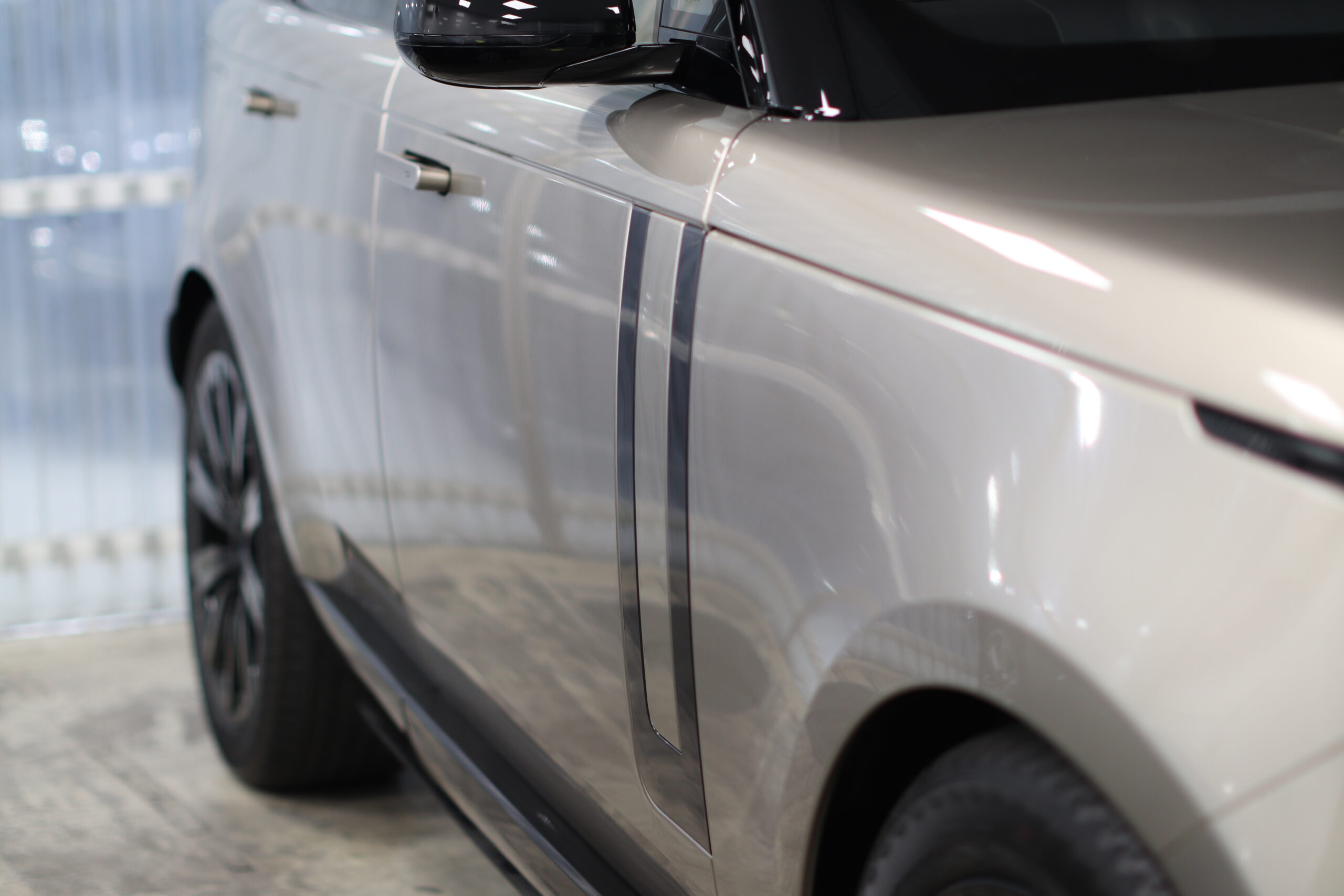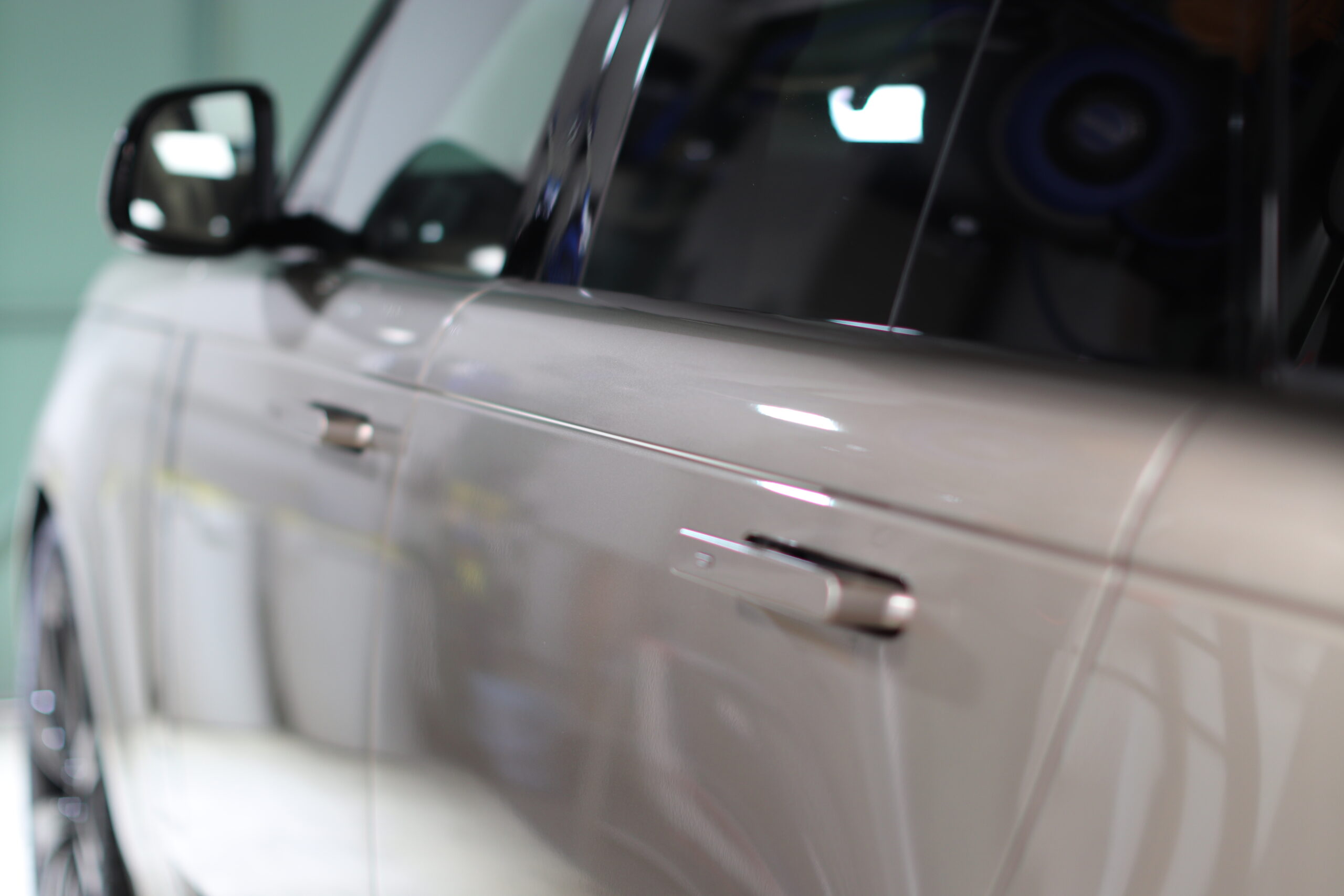 大きな車体に日本の駐車環境がなかなか合わない今どのき大型SUVのレンジローバー、ドアを開けた時にドアなどが壁にあたりドアのエッジが欠けてしまう悲惨なトラブルを少しでも防ぐためにドアエッジにプロテクションフィルムを施工します。