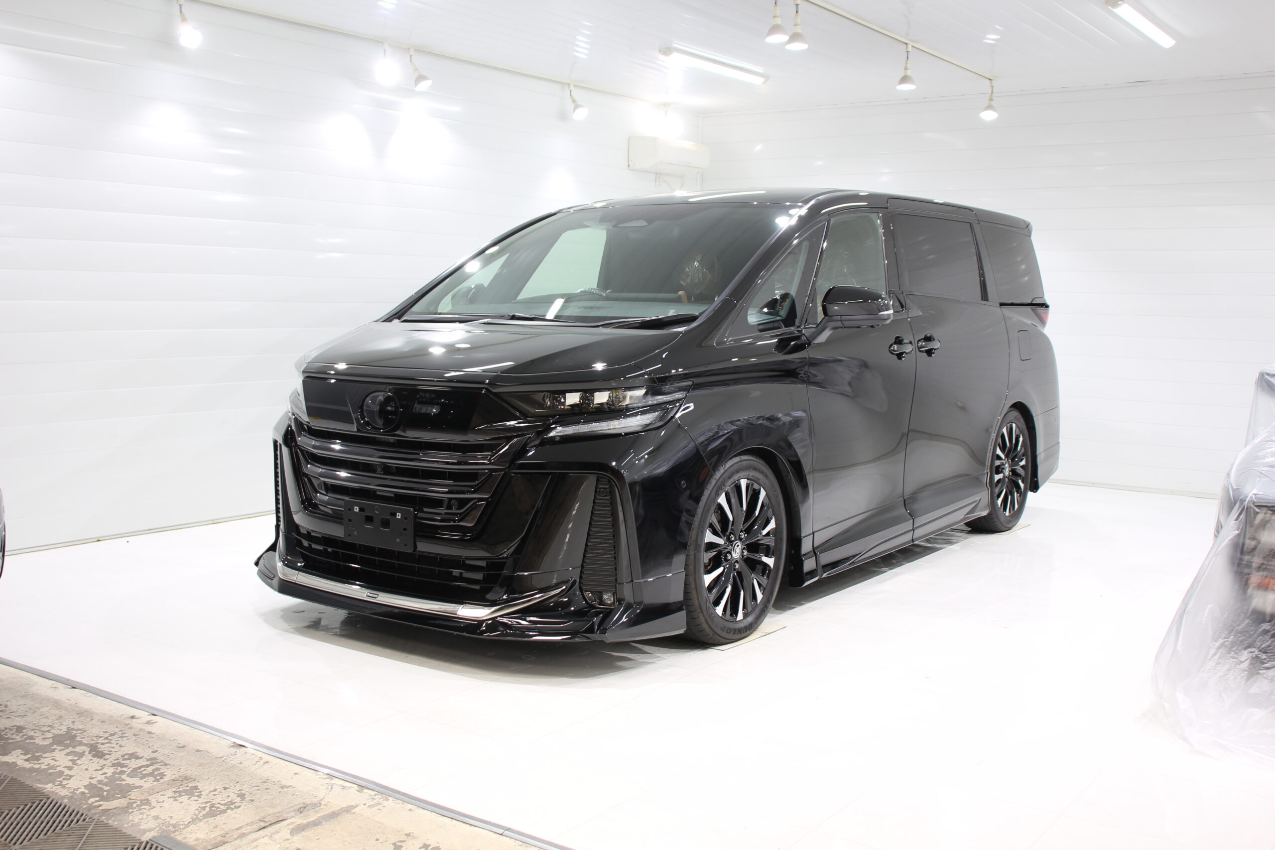 真っ黒な車体がイカついヴェルファイア、黒く輝くボディーにするために丁寧に設備の整った環境で下地処理したのちにボディーコーティングいたします。