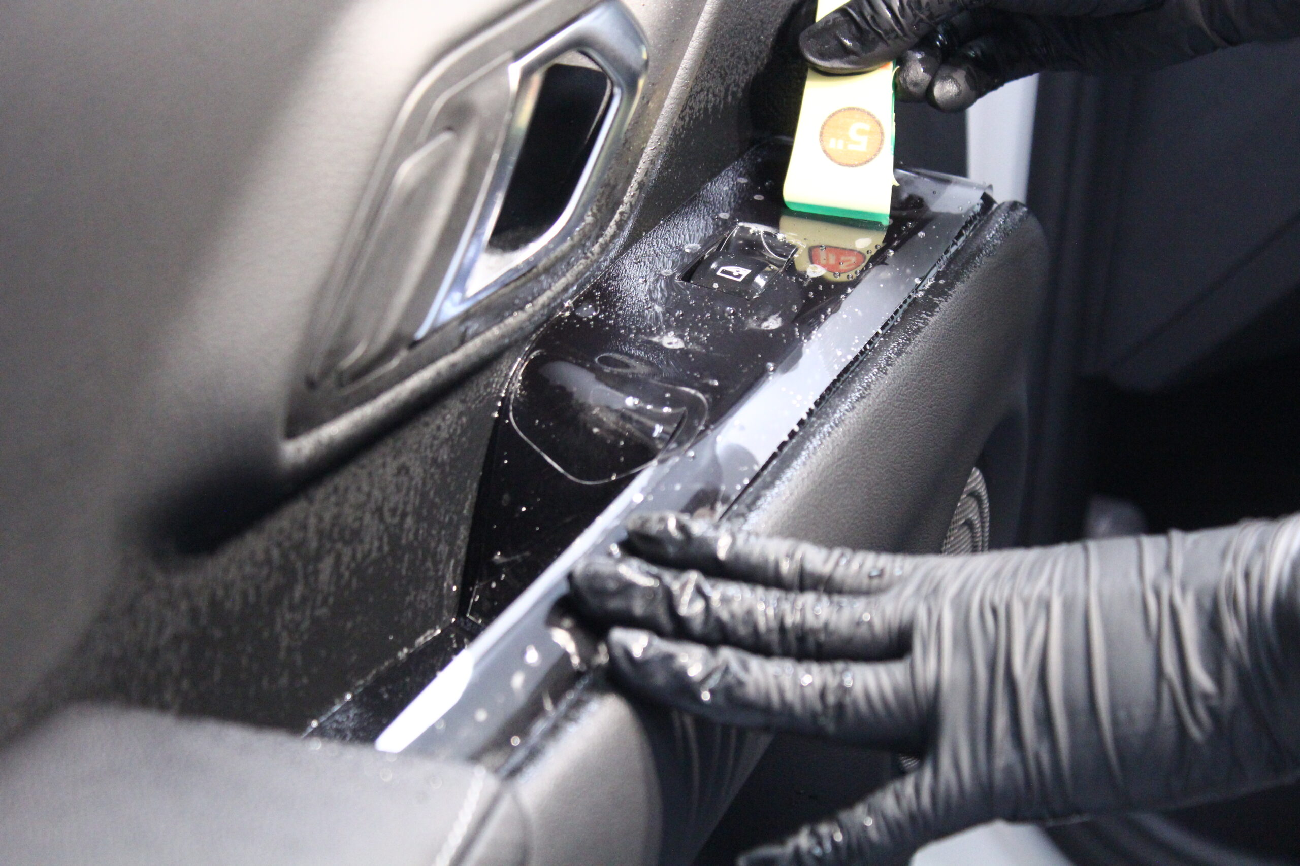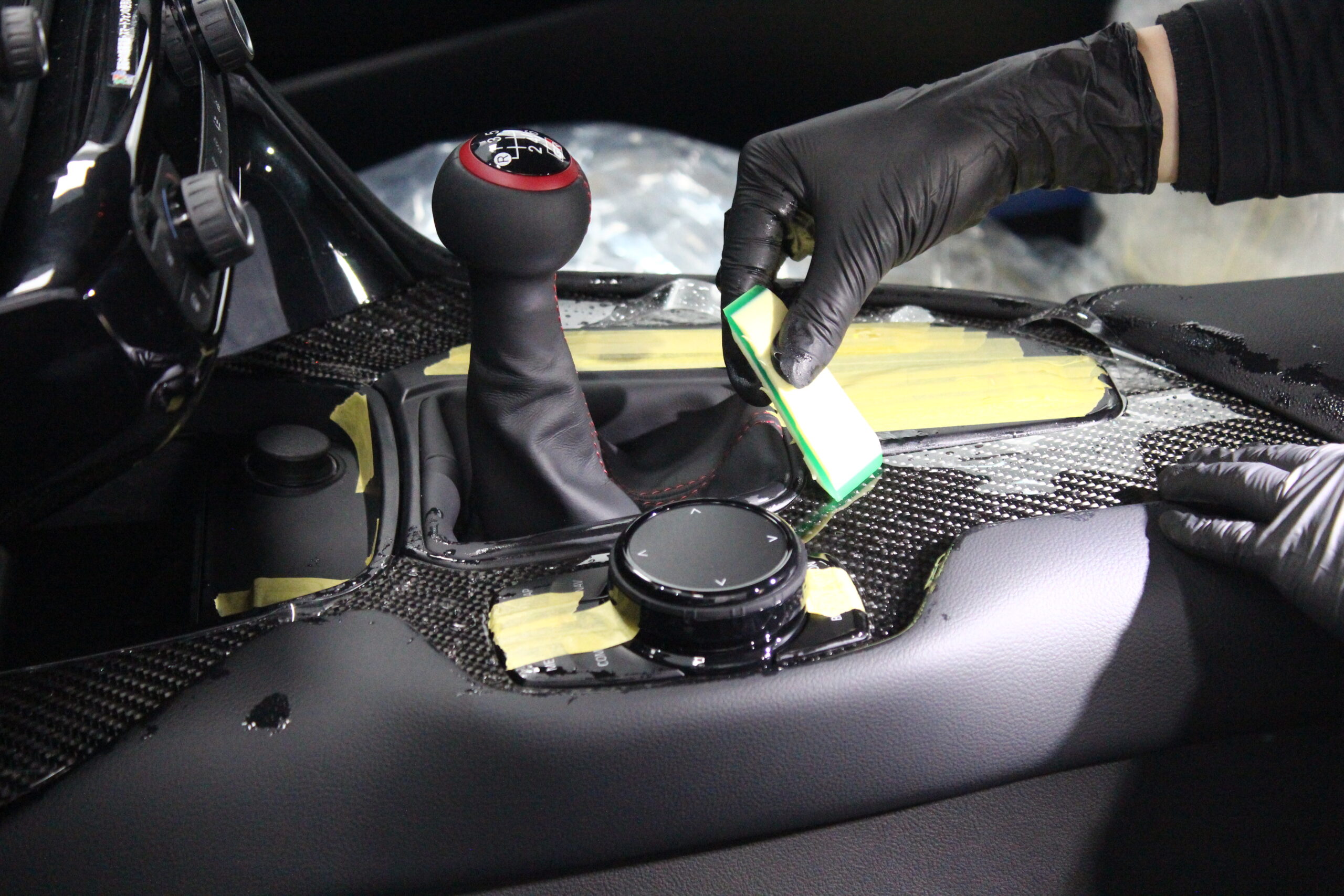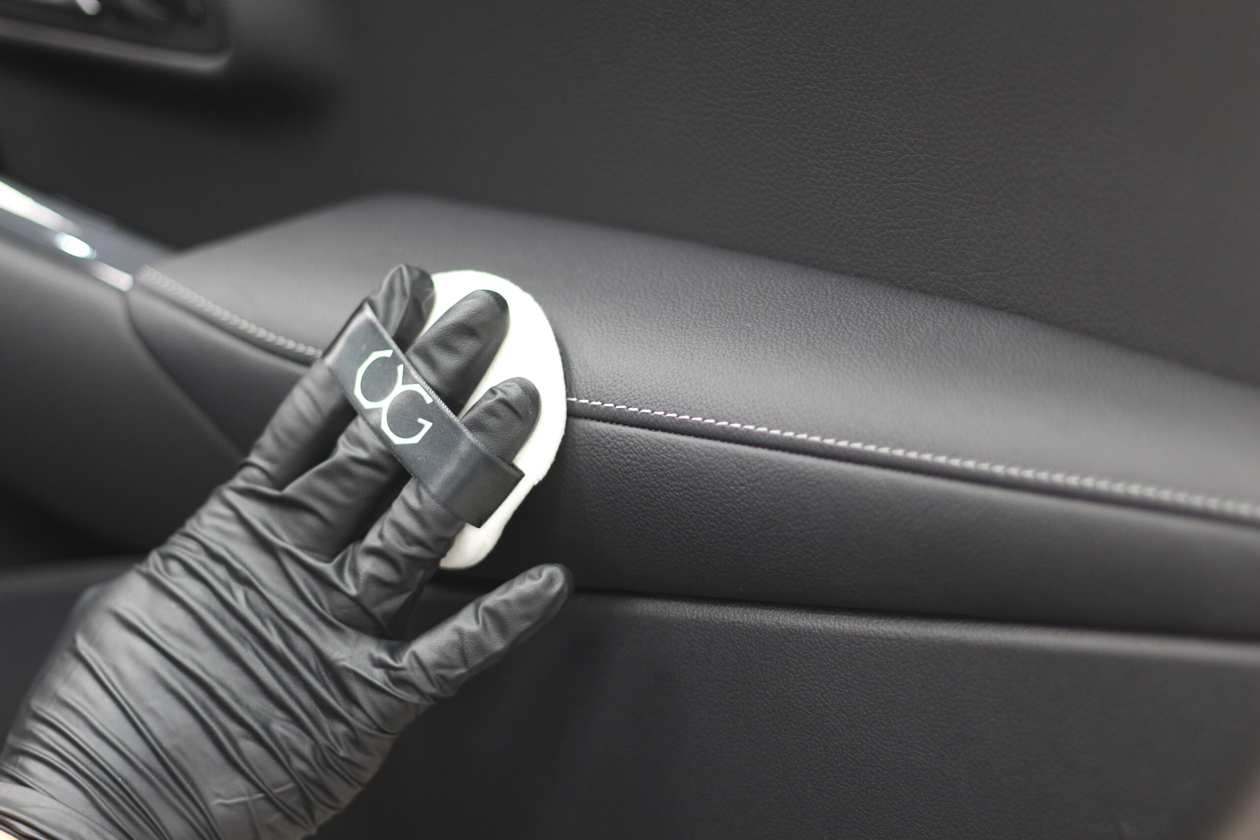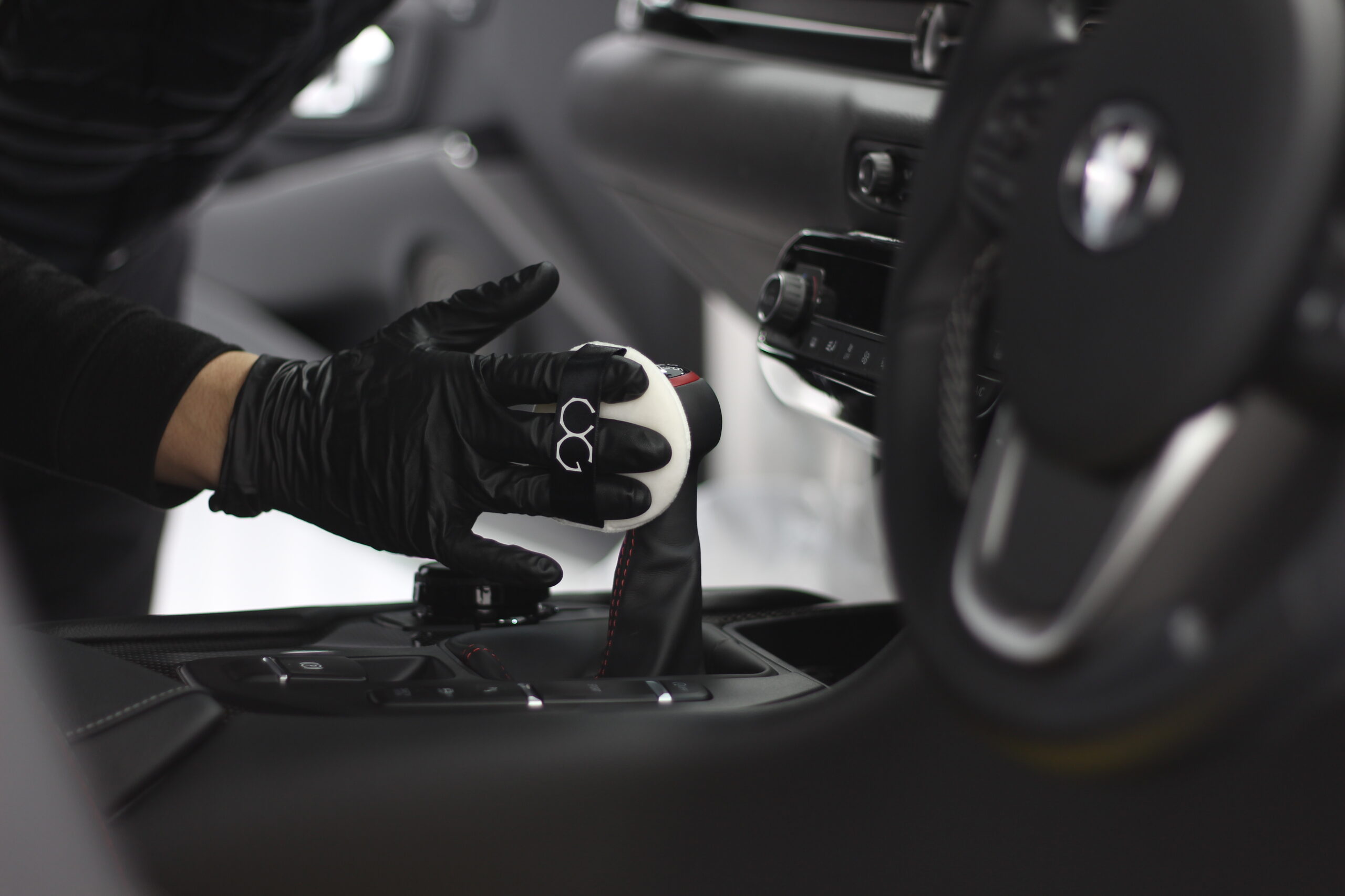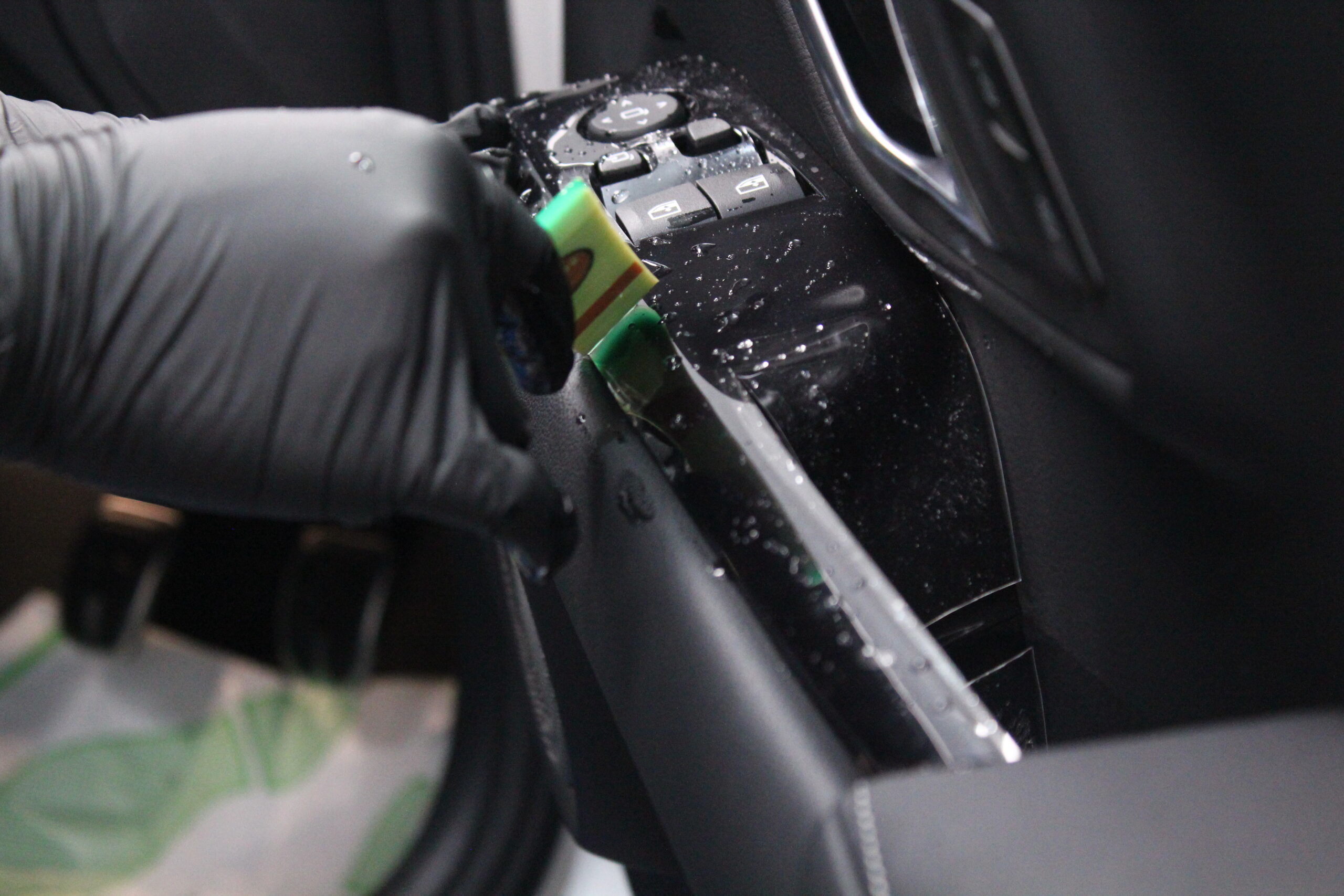 内装部分には一部レザーが採用されているパーツがあるので、そちらはレザーコーティングを施工して操作パネルにはプロテクションフィルムを施工し運転時についてしまうダメージを防ぎます。