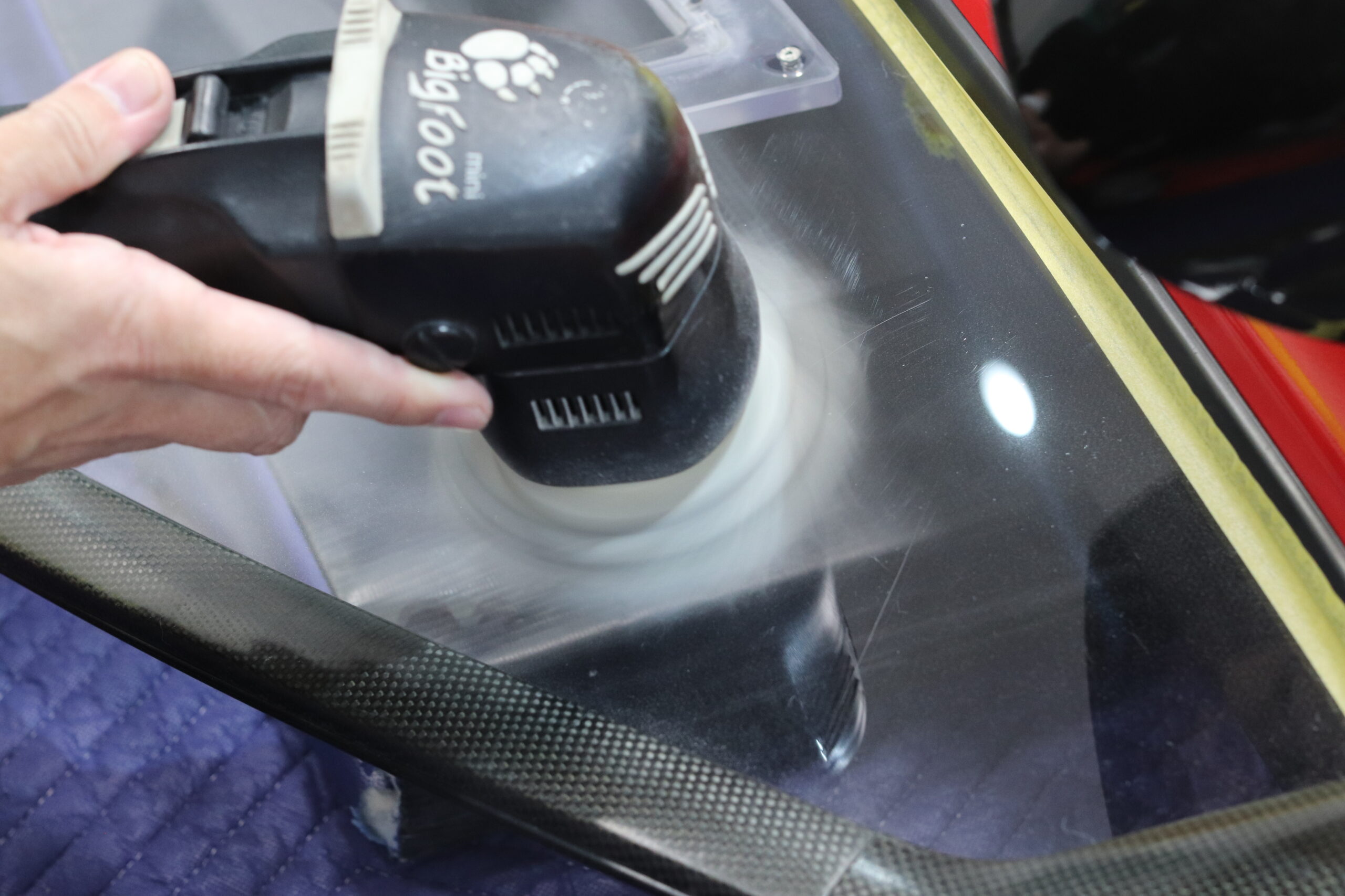 レースカーのドアのアクリルガラスを研磨する