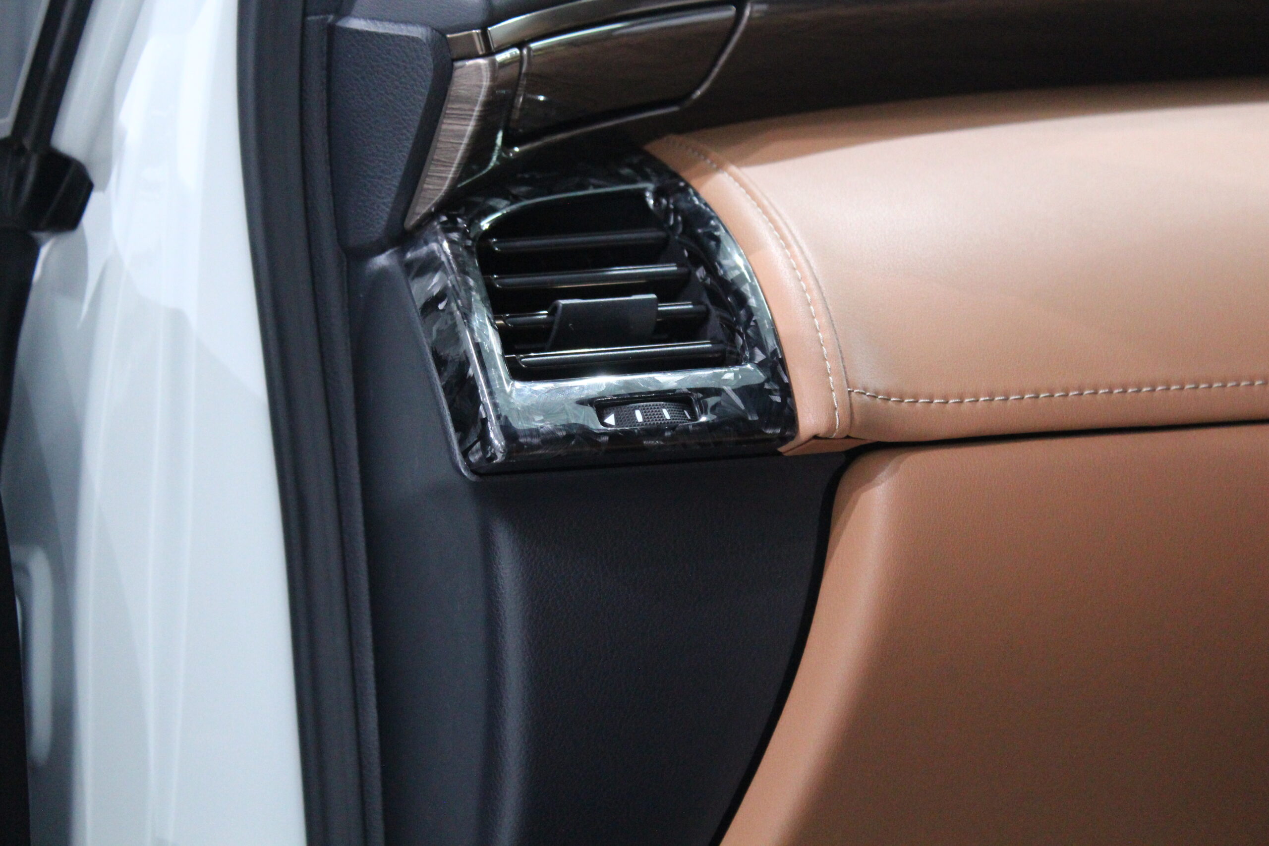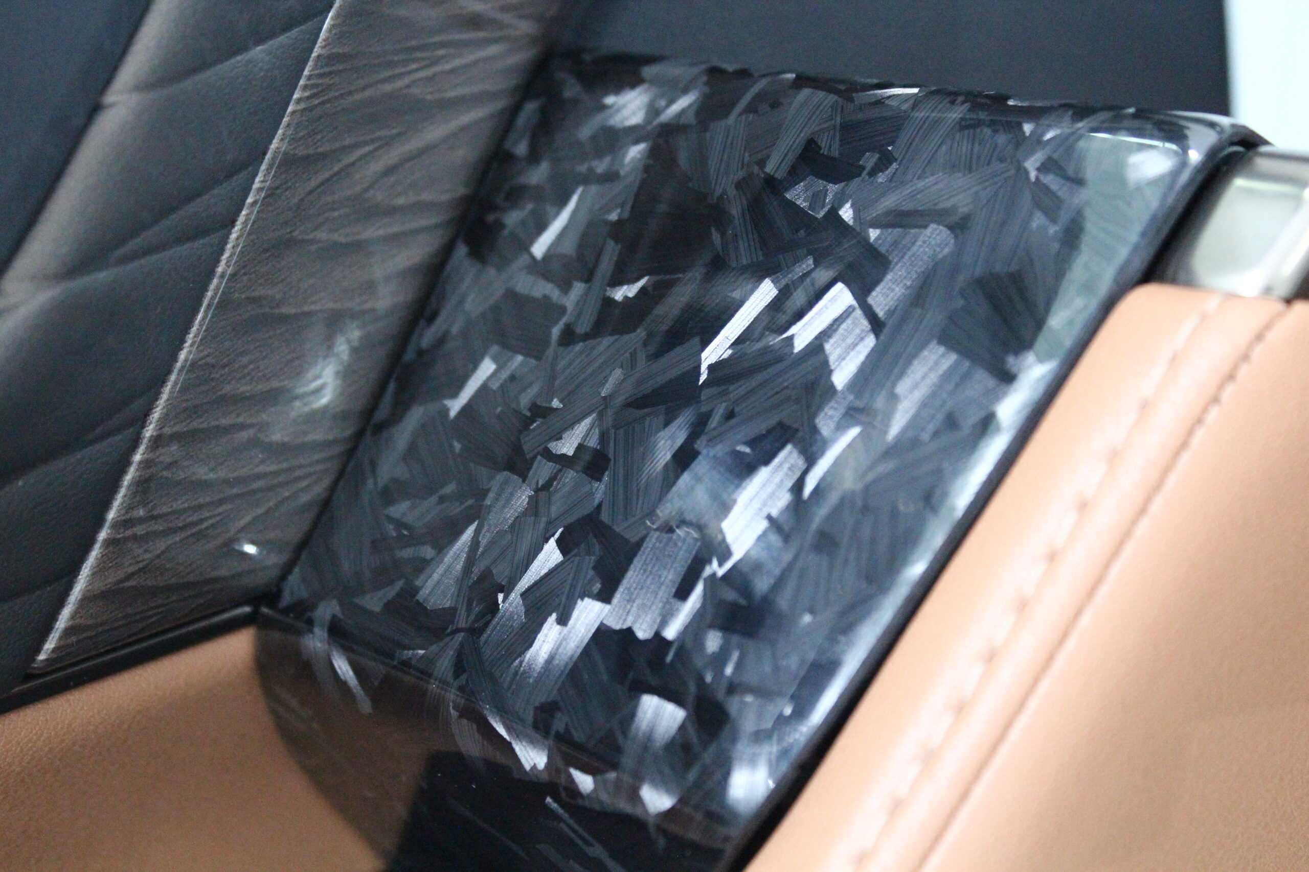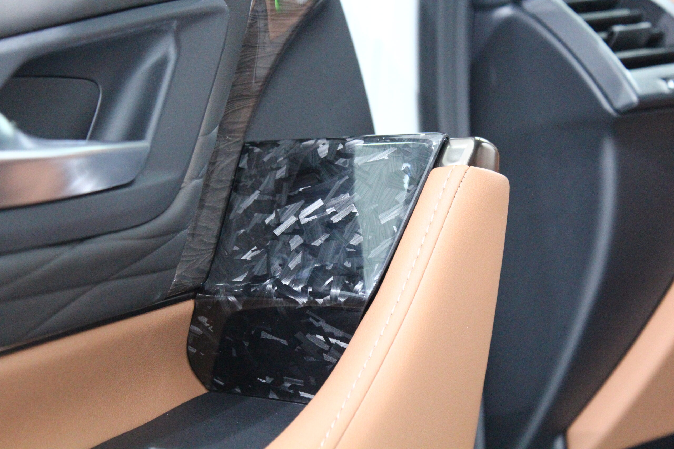 愛車の内装に高級感を出すためにプラスチックパネルに非常にリアルな作りのフォージドプロテクションフィルムを施工します。