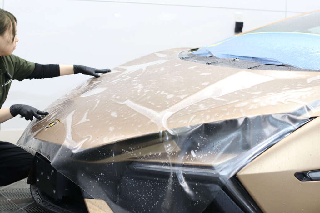 まずはスーパーカー特有の飛石・跳ね石被害からマットプロテクションフィルム施工。3h>