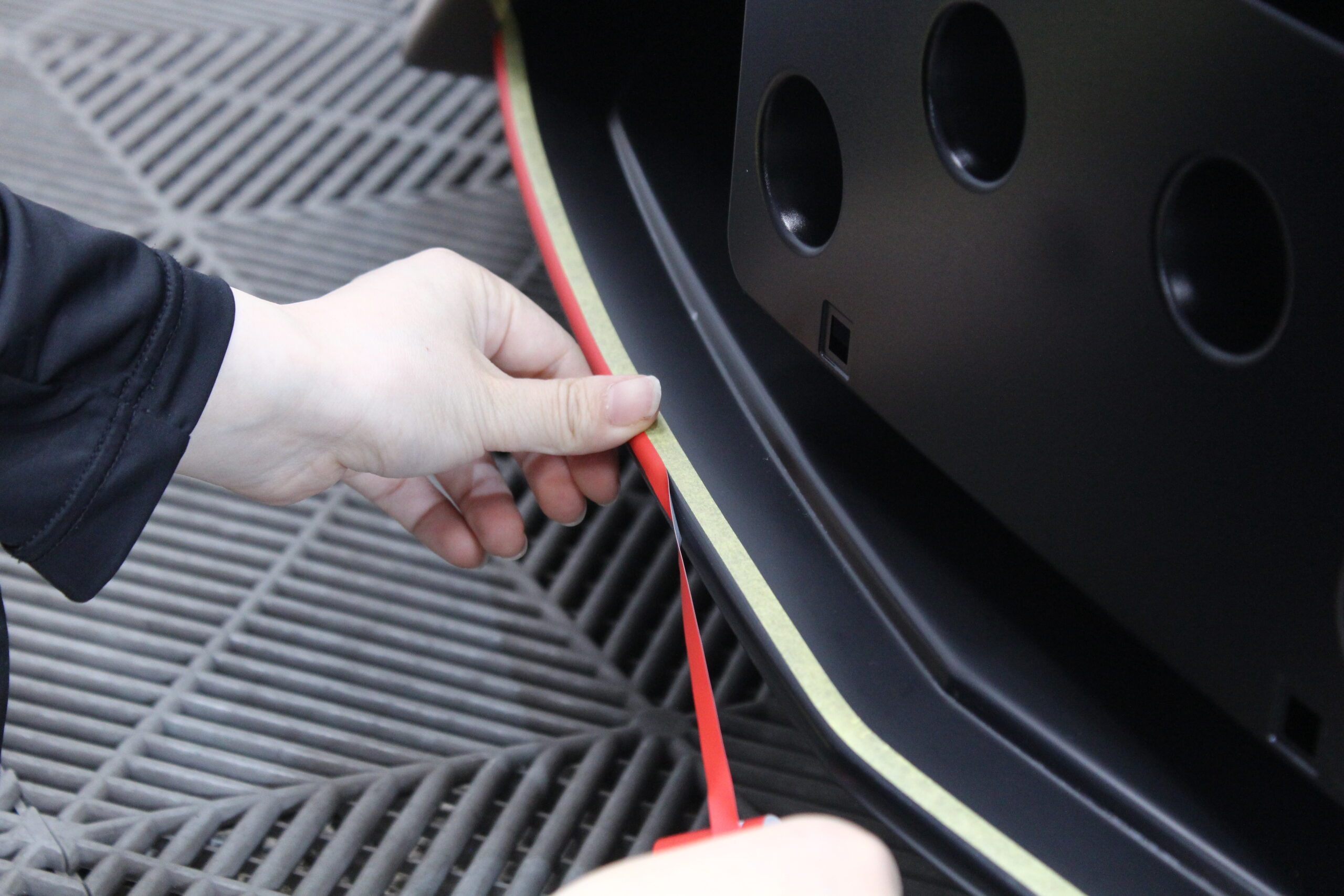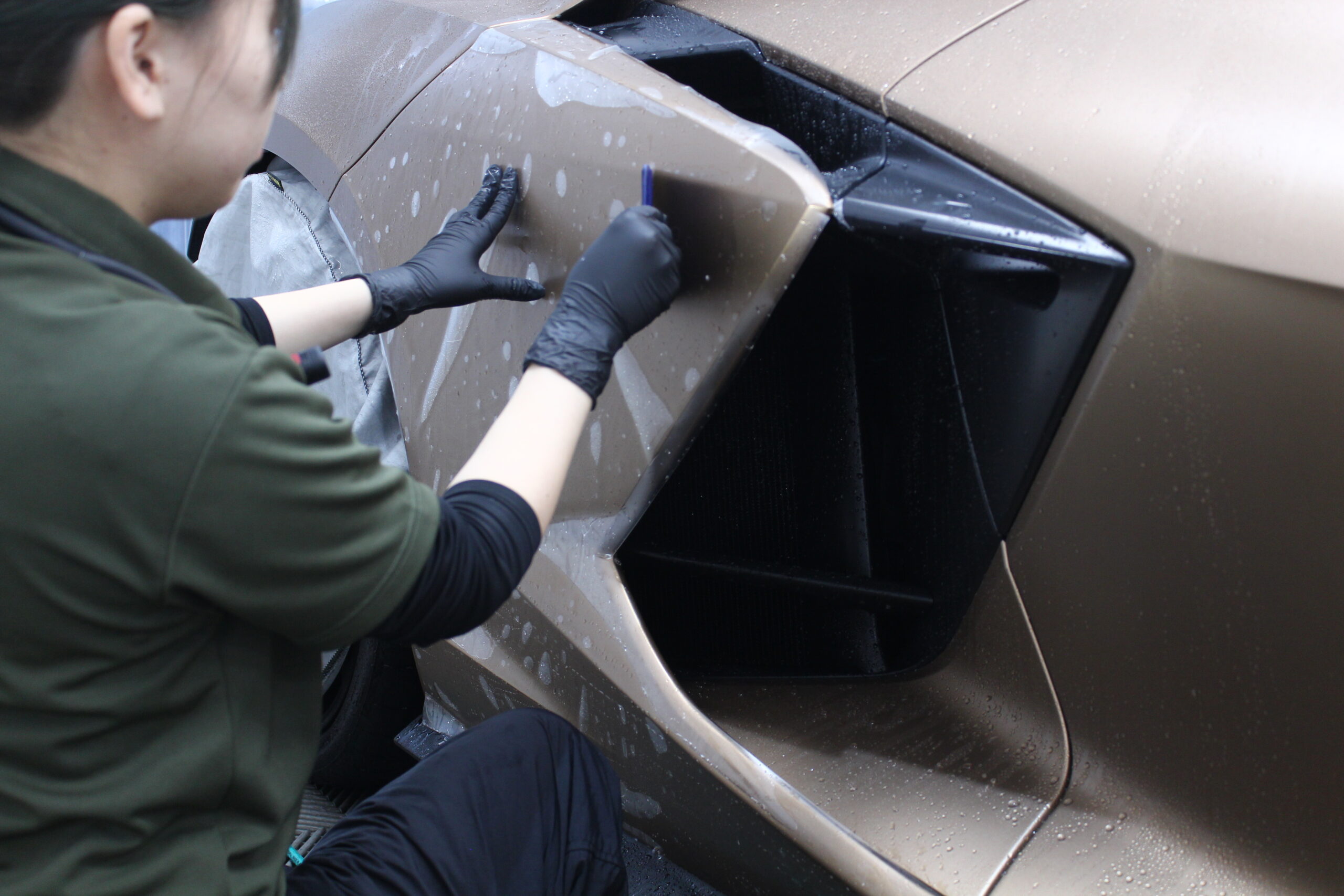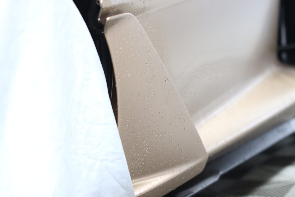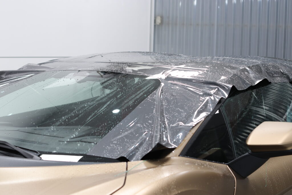 前車のから飛んでくる石が当たりやすい場所と自分の車が跳ねあでげて当たってしまい場所にマット塗装専用のプロテクションフィルムで塗装を守ります。