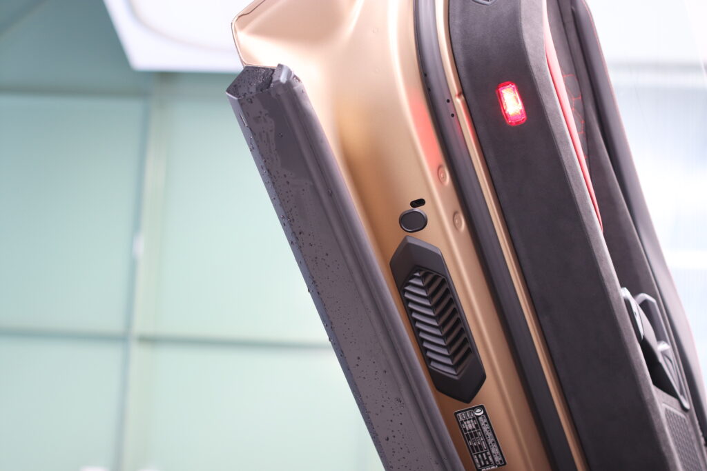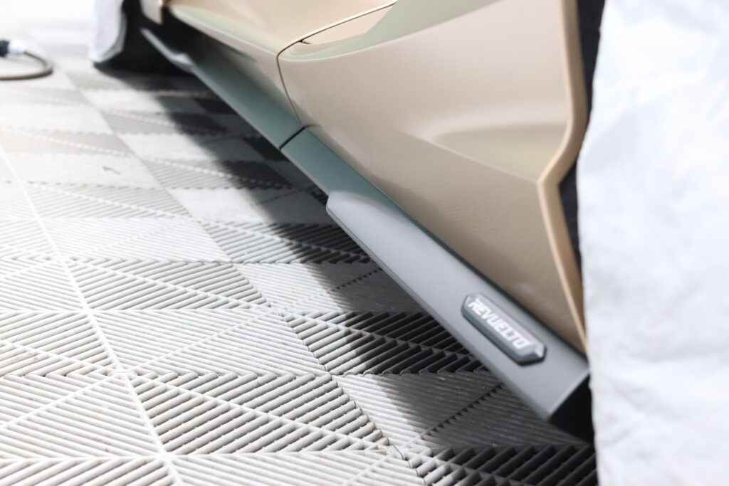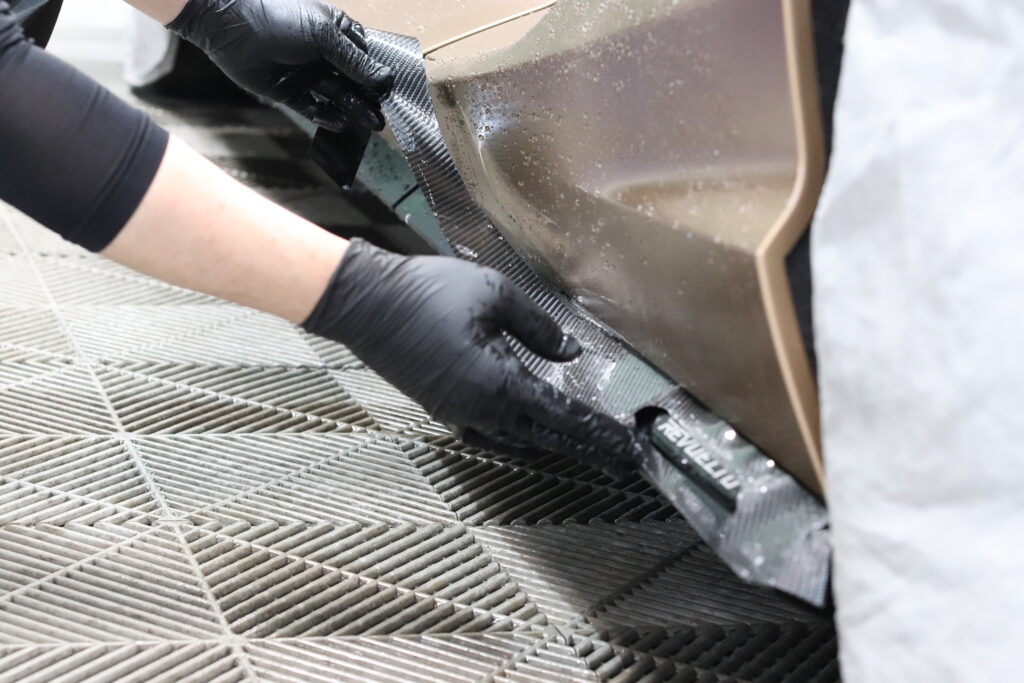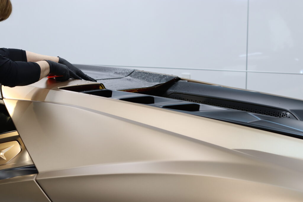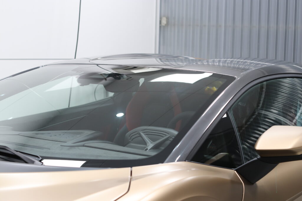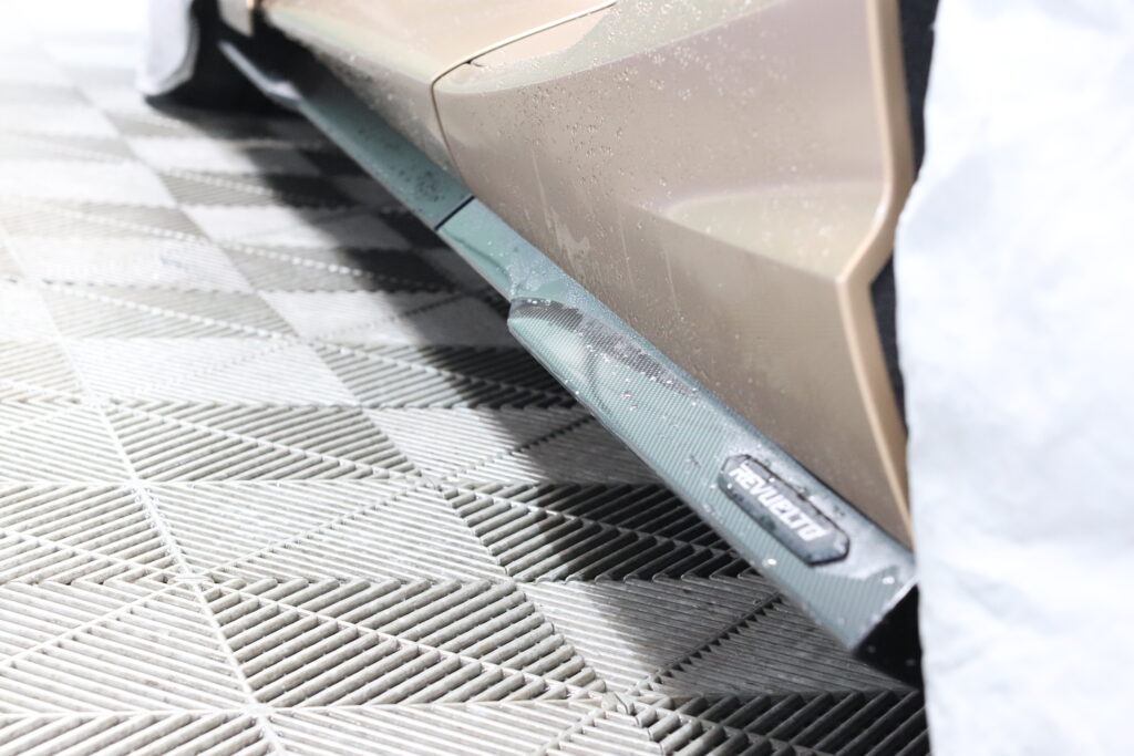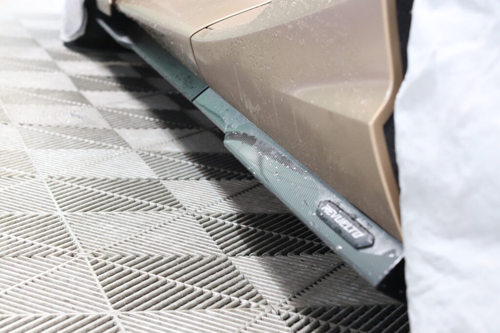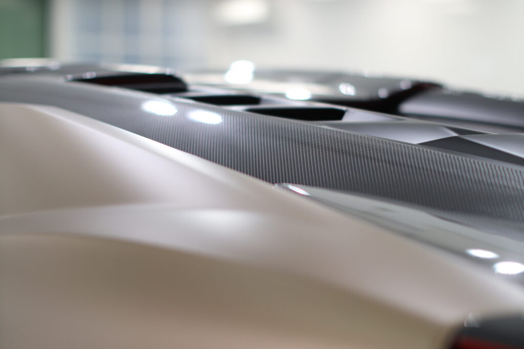 ルーフやサイドステップにはカーボン調のリアルなプロテクションフィルムを施工することで、守りながら雰囲気を一気に変えていきます。
