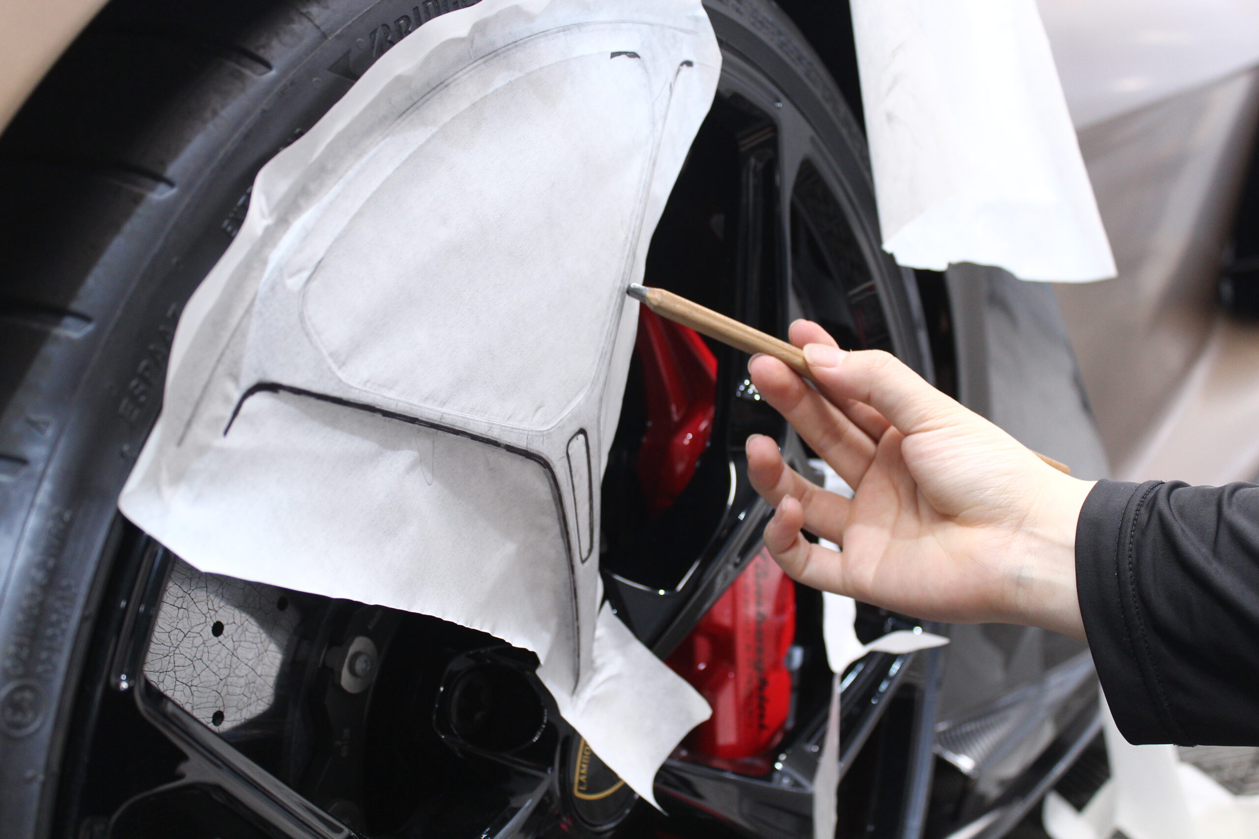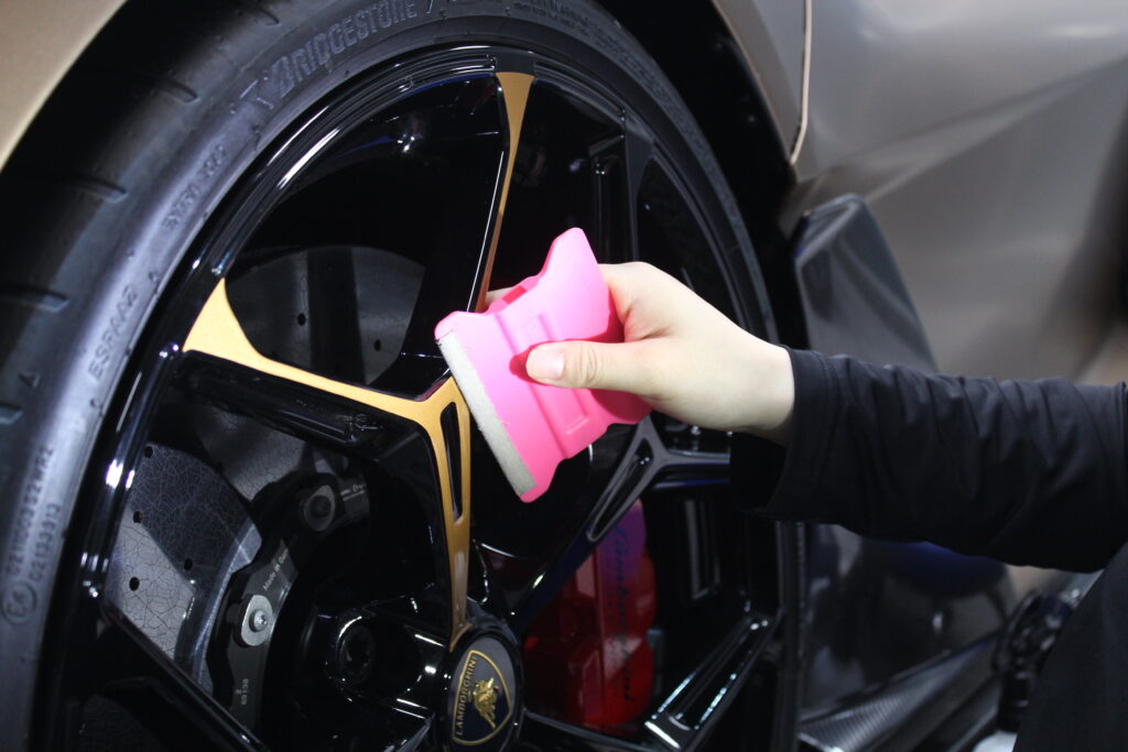 ホイールを立体的に見せるためにラッピングフィルム加工。