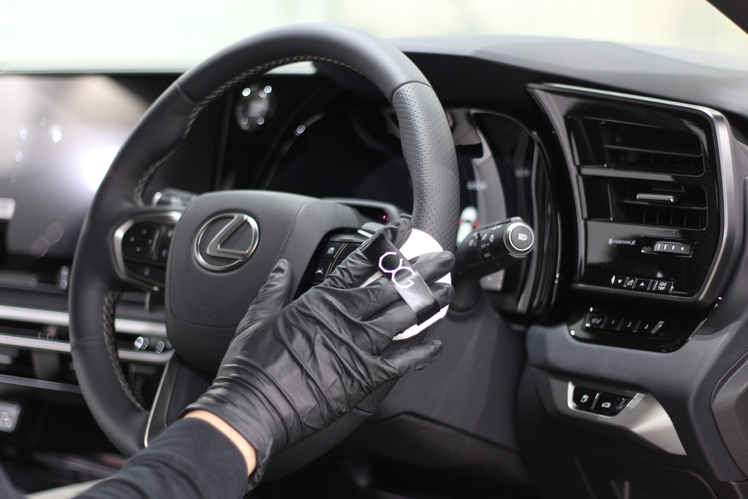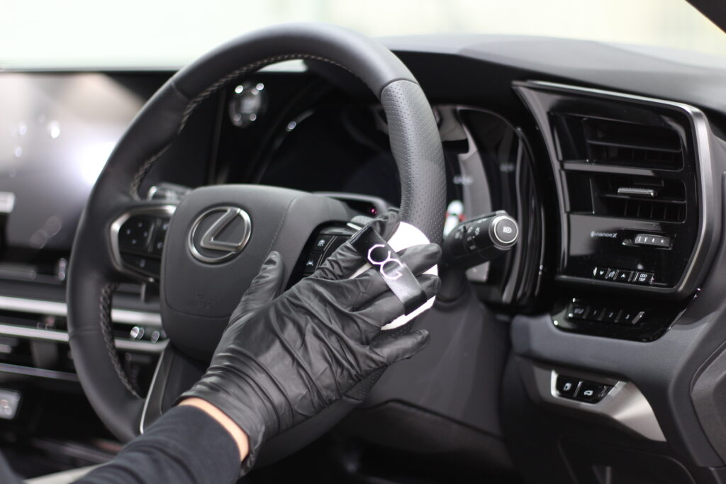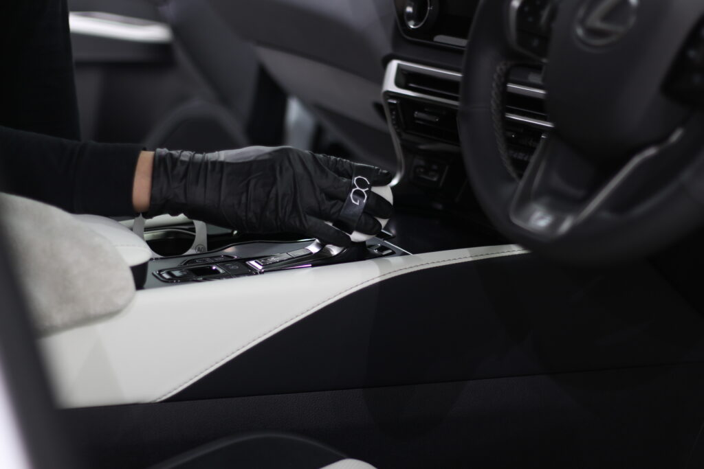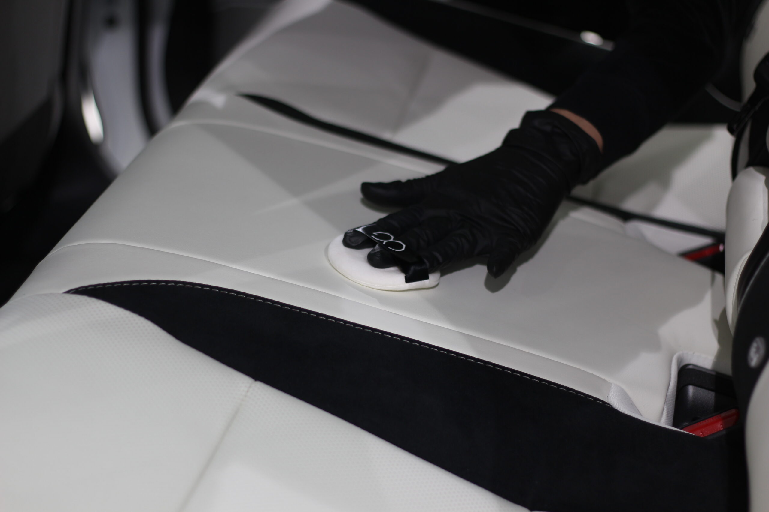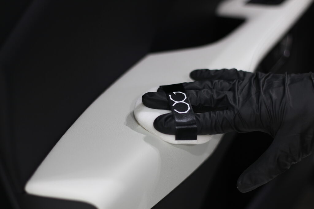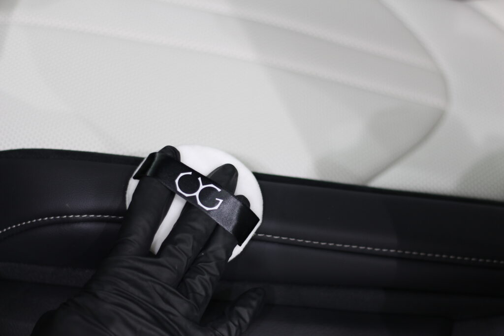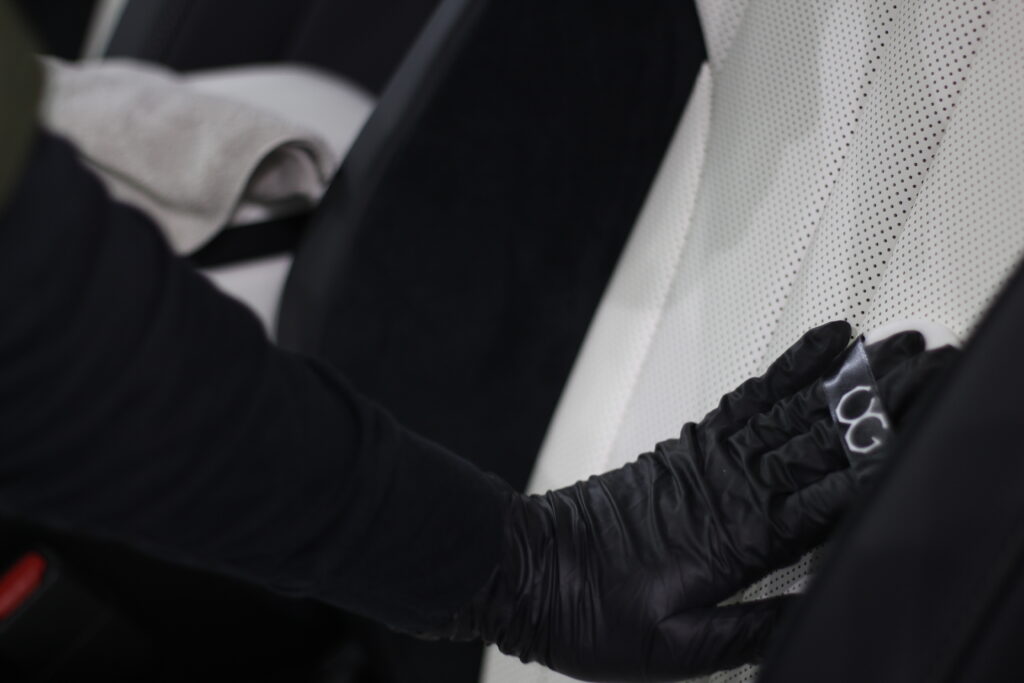 そんなホワイトレザーに汚れがついても簡単な水拭きで掃除できるようにレザーコーティングを施工します。