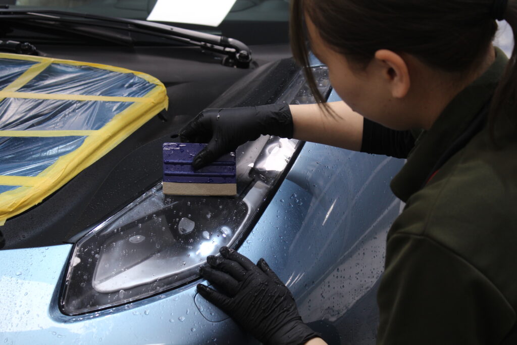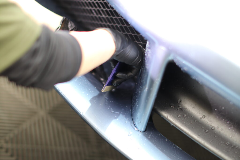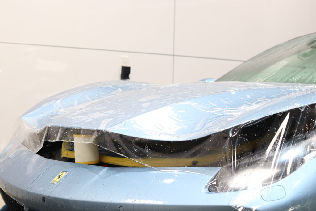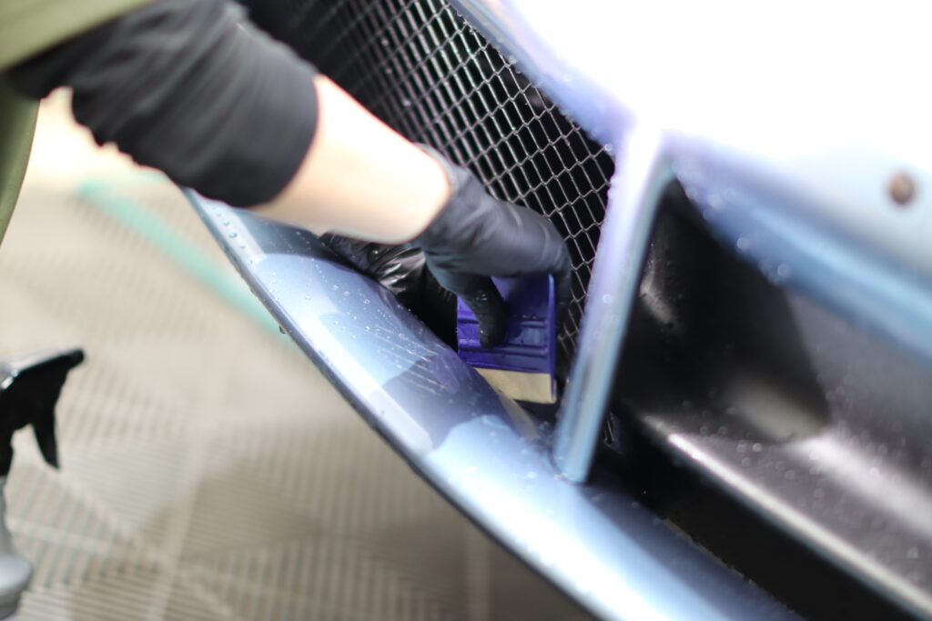 ツーリングの機会やドライブの様な普段使いの車とは違い飛石被害を受けやすい環境の場合は、やはりボディーコーティングでは役不足になってしまうので、フロント周りにはプロテクションフィルムを貼っていきます。