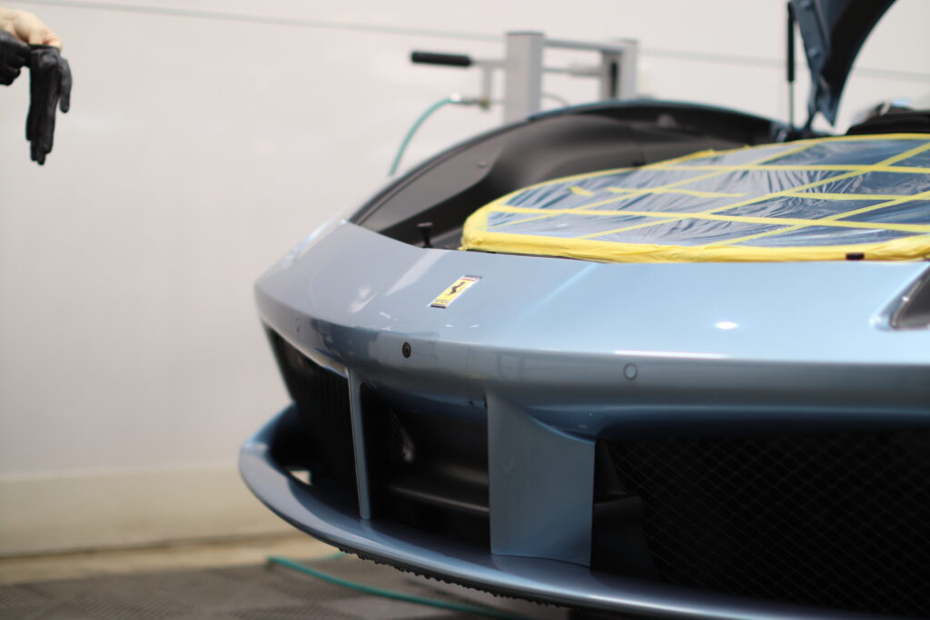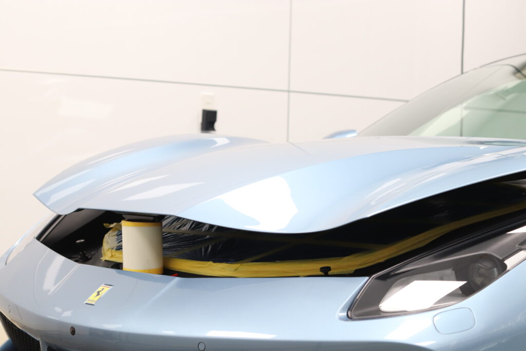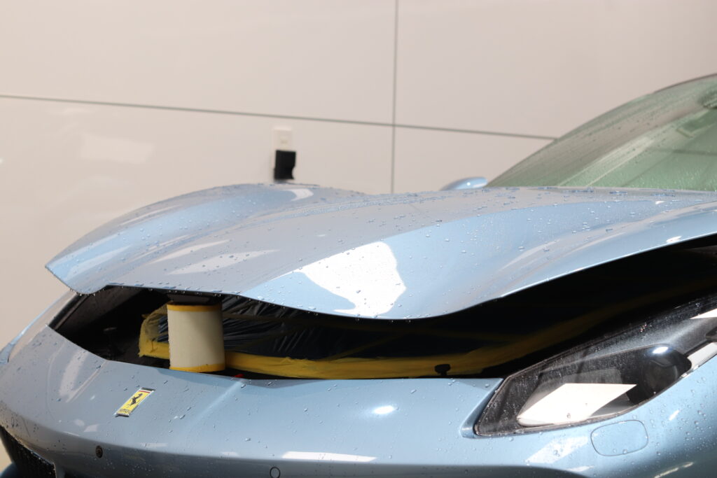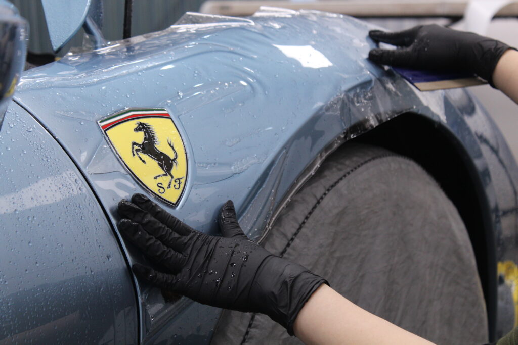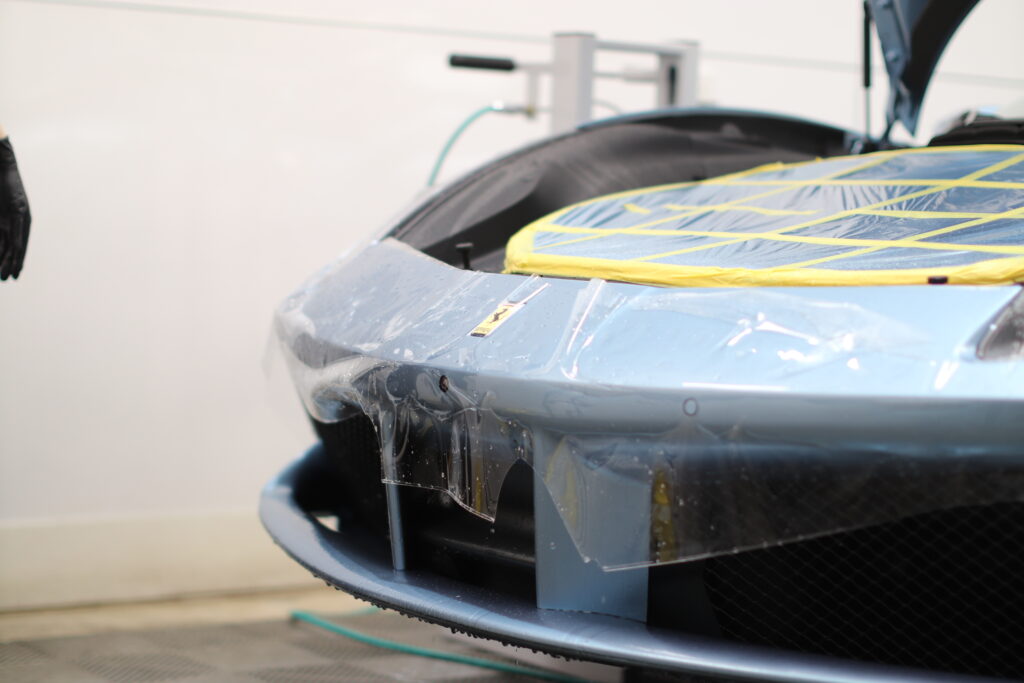 ツーリングの機会やドライブの様な普段使いの車とは違い飛石被害を受けやすい環境の場合は、やはりボディーコーティングでは役不足になってしまうので、フロント周りにはプロテクションフィルムを貼っていきます。